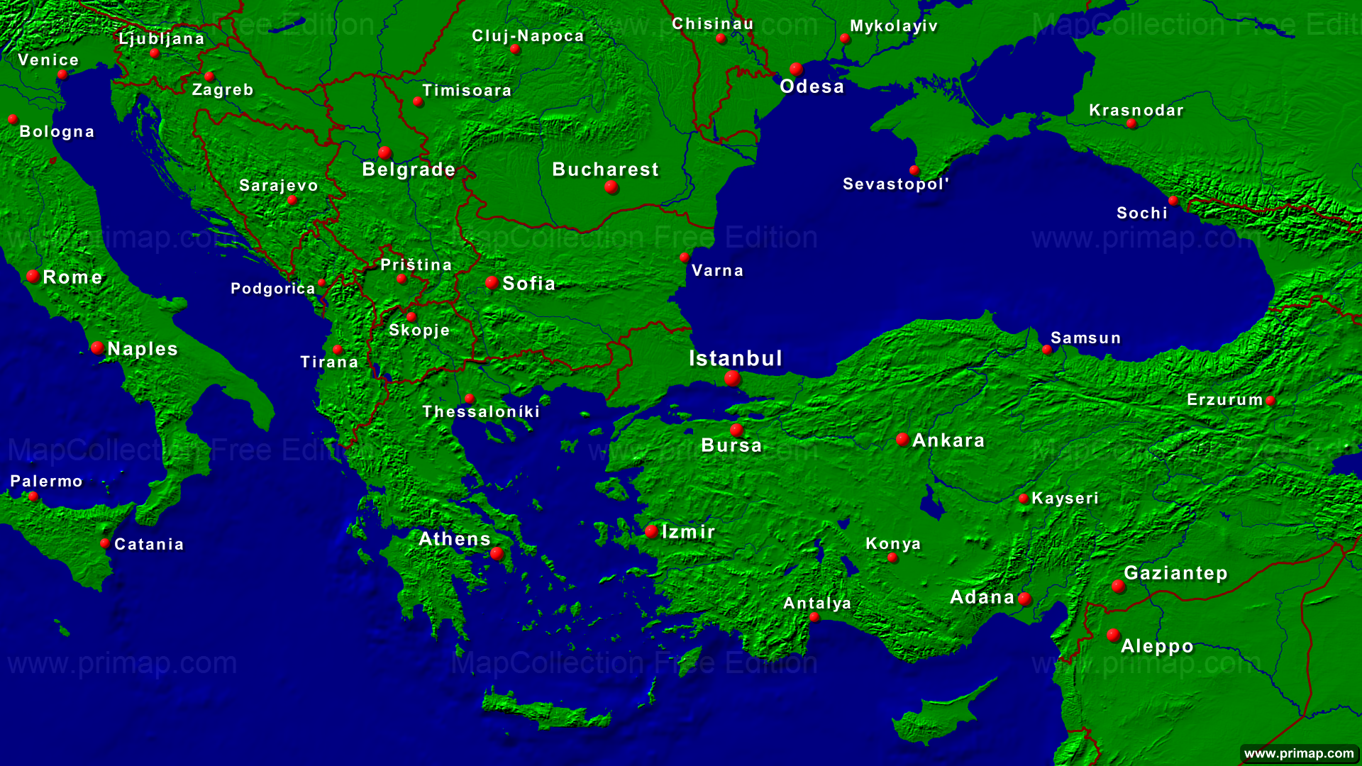 Continental maps - Europe-Southeast - Towns + Borders - 1920x1080 (16:9) large Font