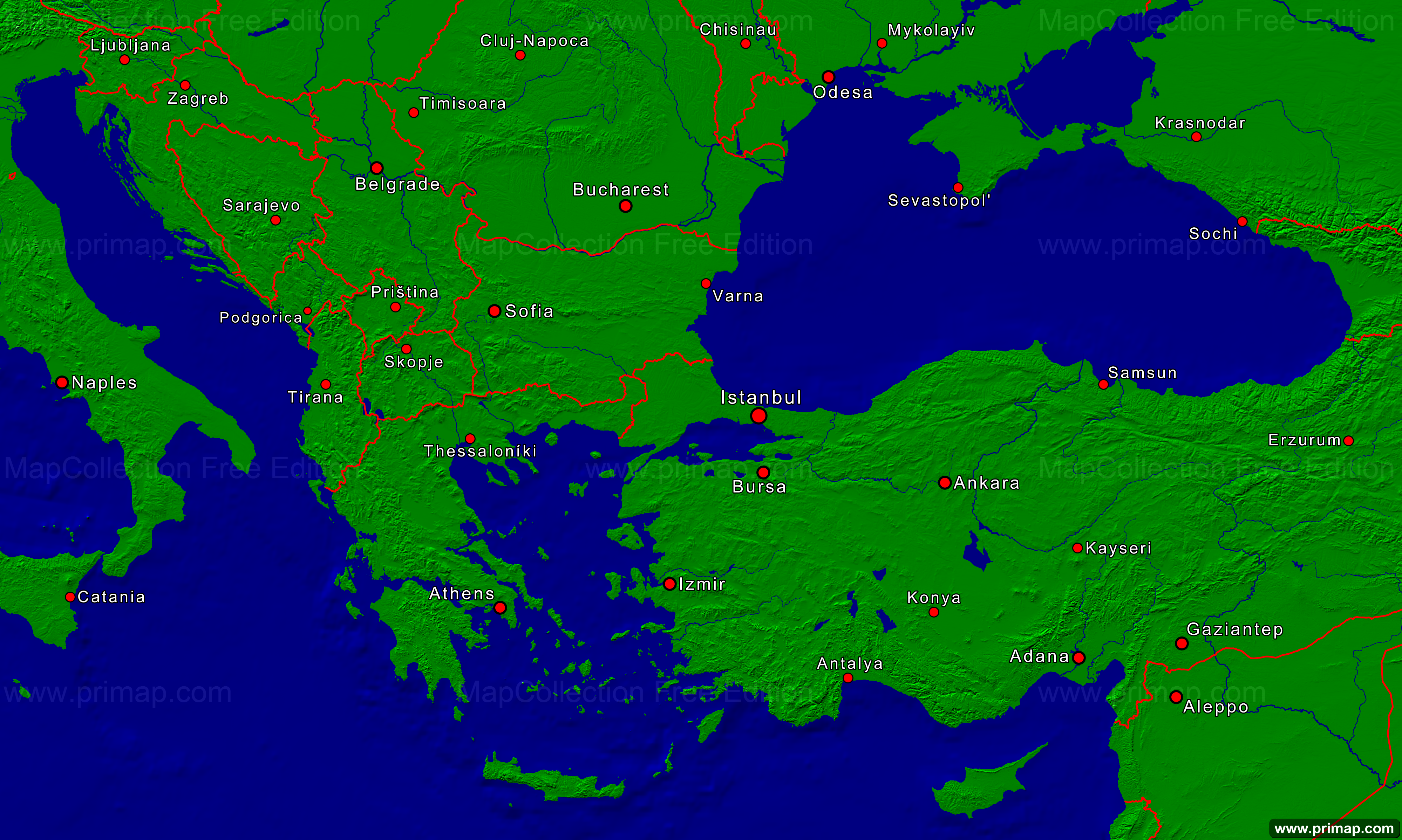 Continental maps - Europe-Southeast - Towns + Borders - 4000x2398 small Font