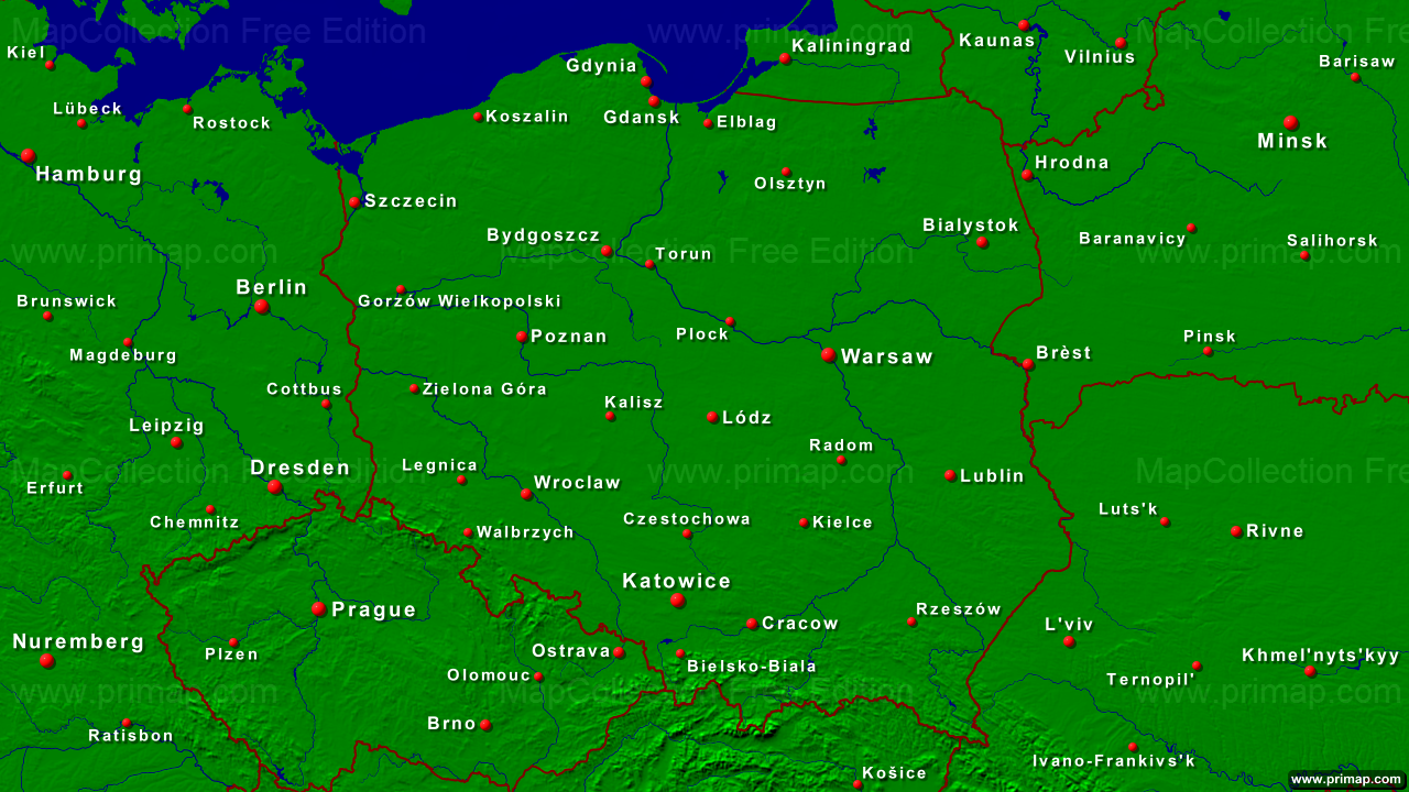 National maps - Poland - Towns + Borders - 1280x720 (16:9) large Font