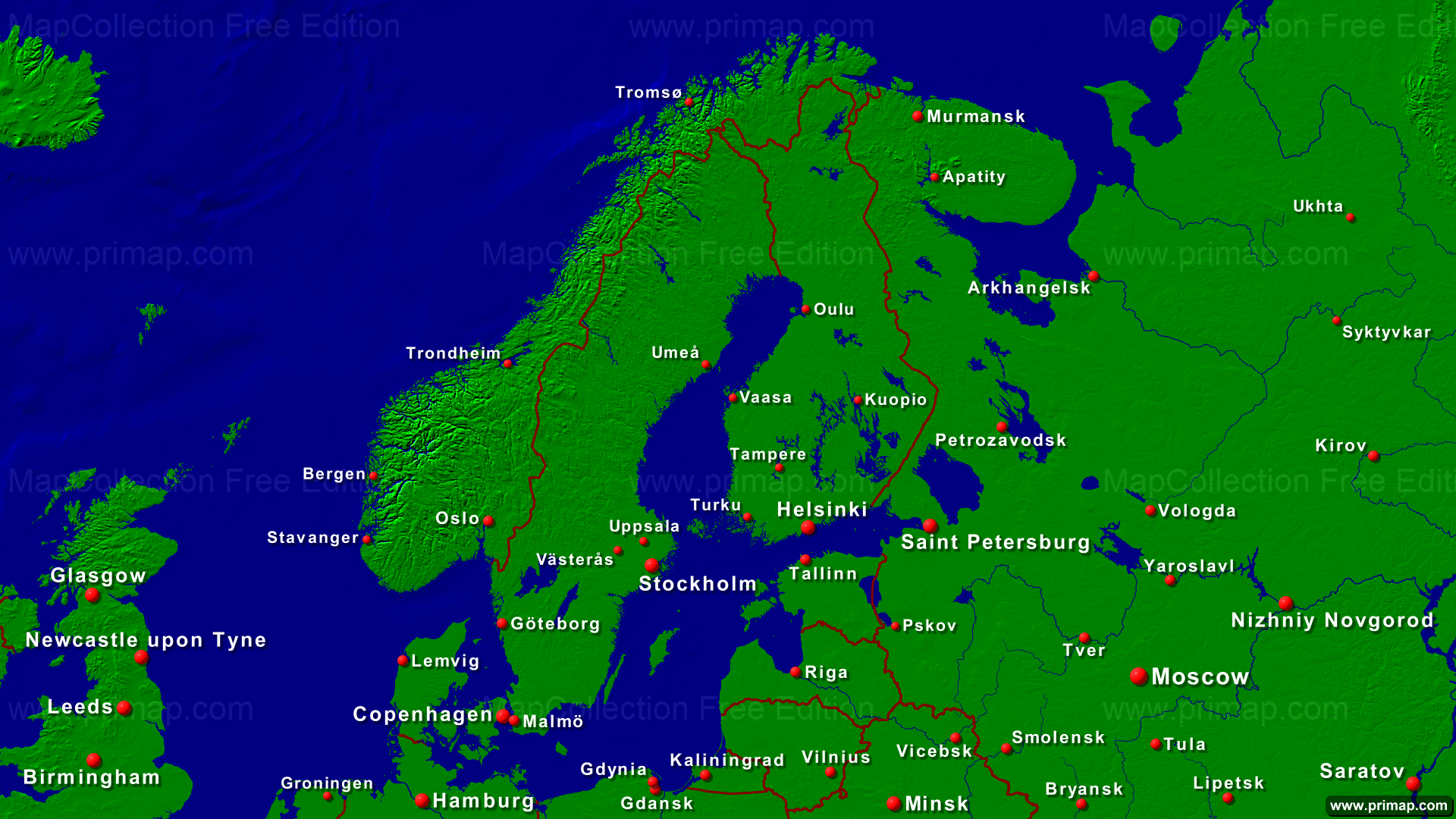 National maps - Scandinavia - Towns + Borders - 1920x1080 (16:9) large Font