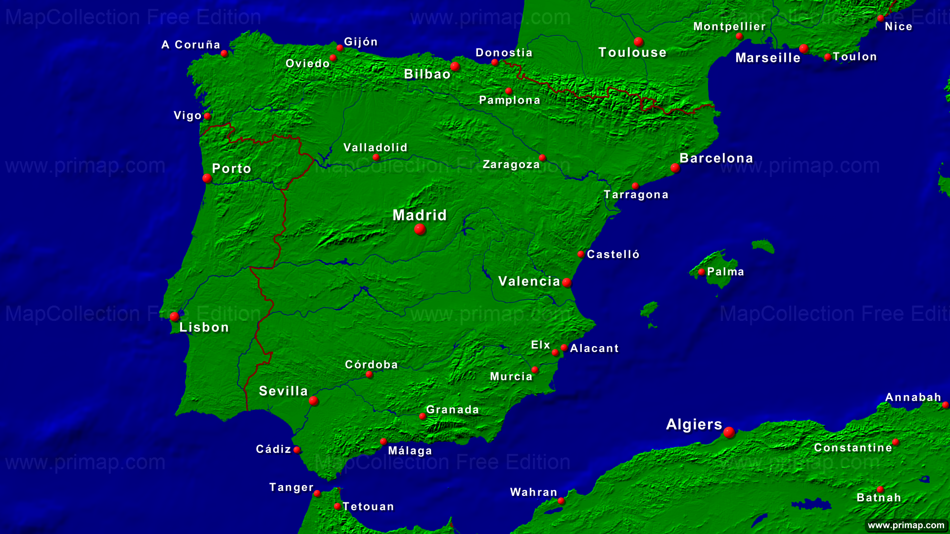 National maps - Spain - Towns + Borders - 1920x1080 (16:9) large Font
