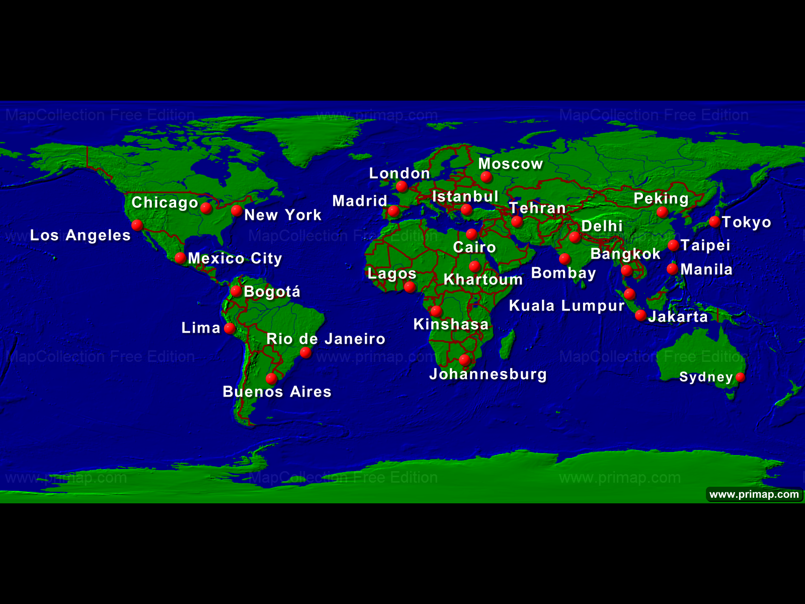 World maps - World (Type 1) - Towns + Borders - 1600x1200 (4:3) large Font