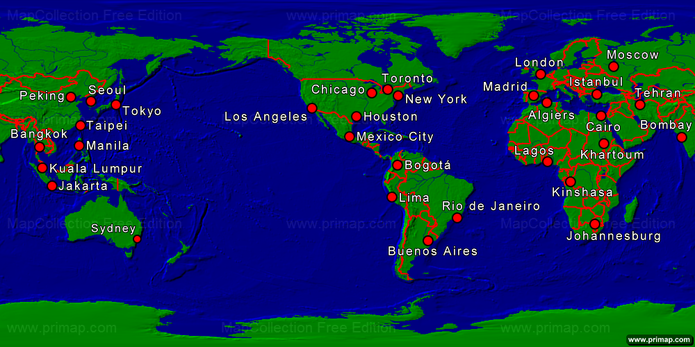 World maps - World (Type 4) - Towns + Borders - 1000x500 small Font