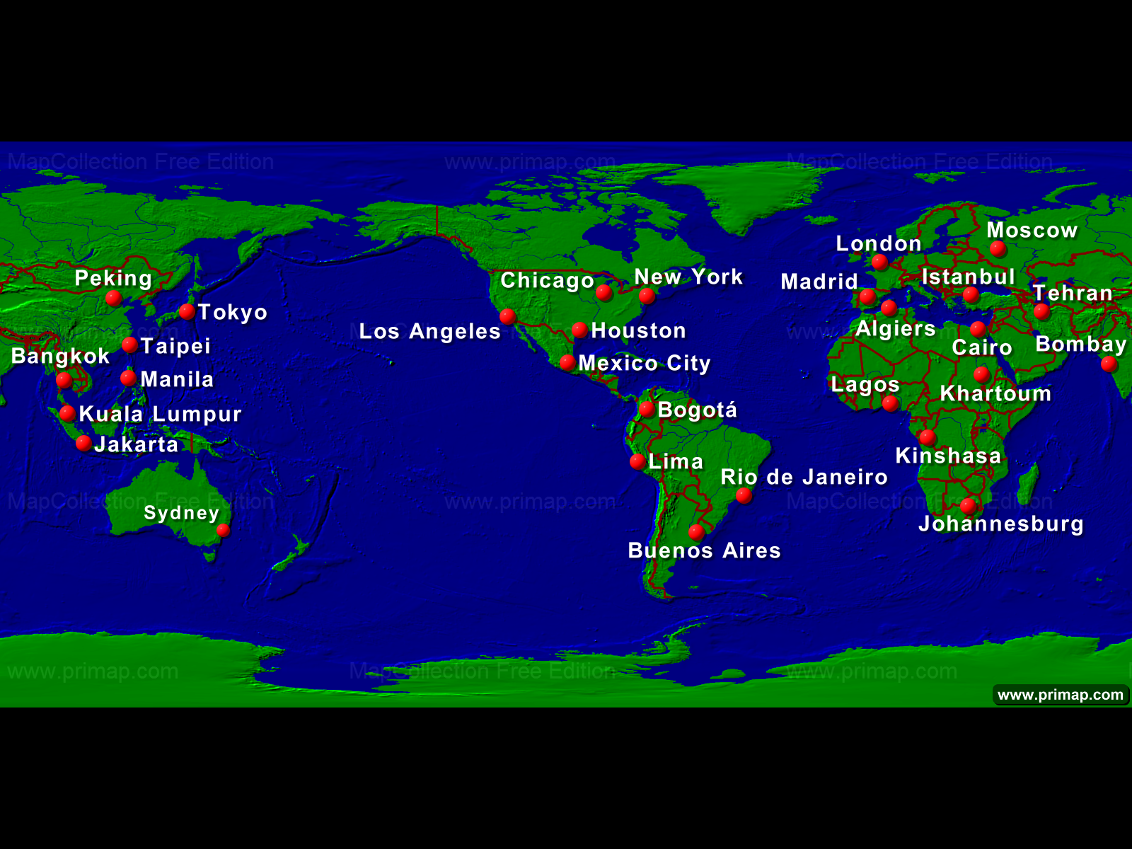 World maps - World (Type 4) - Towns + Borders - 1600x1200 (4:3) large Font